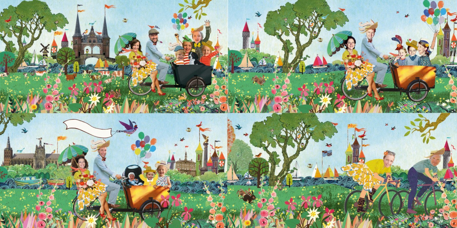 Dan is deze kleurrijke trouwkaart met jullie eigen gezin op een bakfiets in een kleurrijk bloemen landschap iets voor jullie!