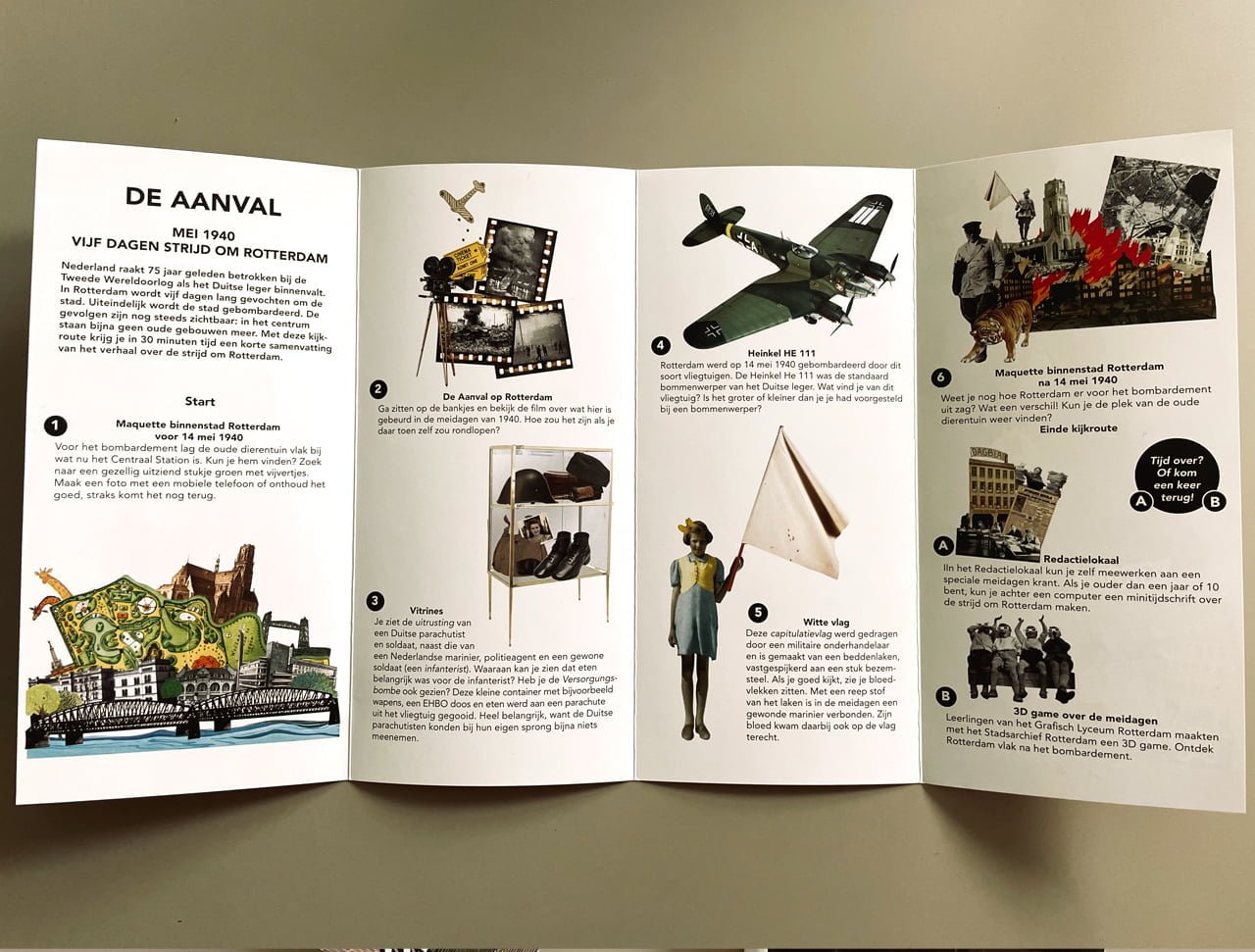 Grootzus maakte voor de tentoonstelling De Aanval over het bombardement op Rotterdam in de Tweede Wereldoorlog een overzicht plattegrond en illustraties voor het educatieve materiaal voor leerlingen van onder- en bovenbouw.