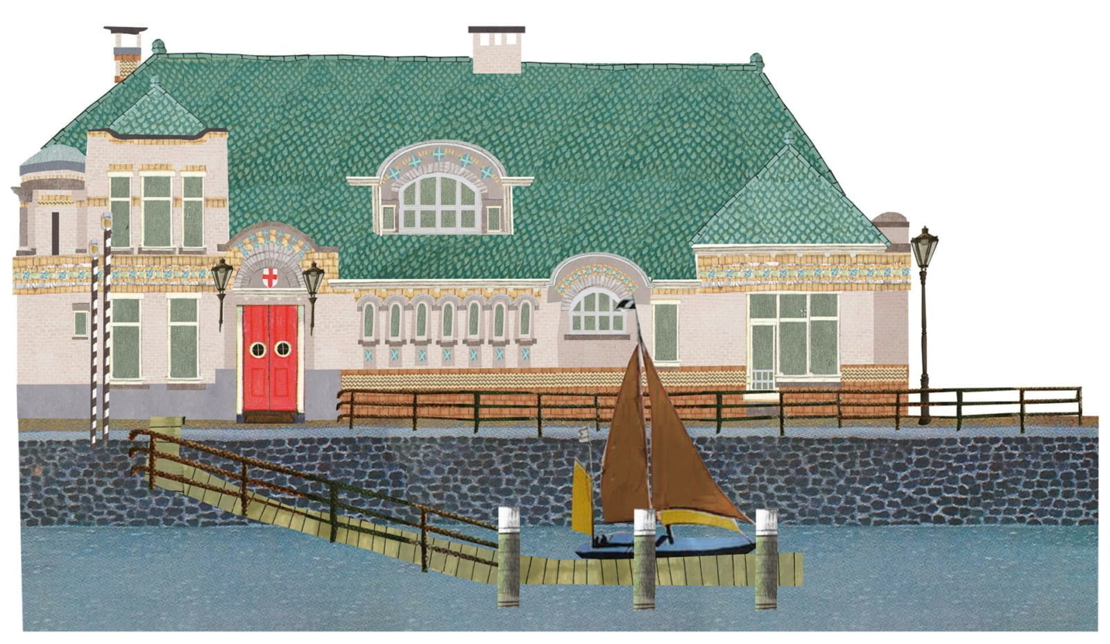 Roei- en zeilvereniging de Maas in het Scheepvaartkwartier in vrolijke collage stijl.